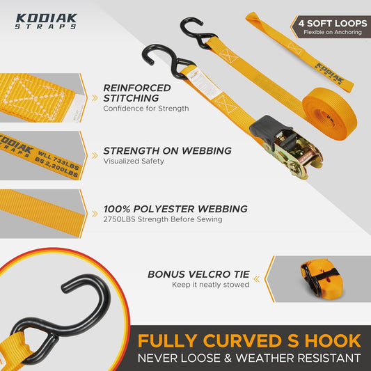 Ratchet Straps Heavy Duty Tie down Strap Set 2200 Break Strength – 1" X 17' 4Pk with Soft Loops Cargo Truck Bed Tie Downs – Coated Deep S-Hook & Carry Bag for Moving, Securing Cargo