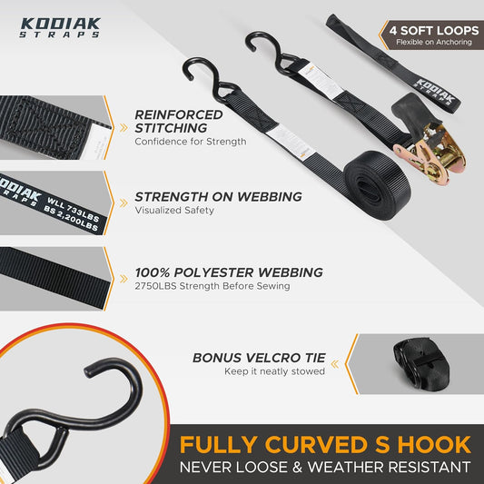 Ratchet Straps Heavy Duty Tie down Strap Set 2200 Break Strength – 1" X 17' 4Pk with Soft Loops Cargo Truck Bed Tie Downs – Coated Deep S-Hook & Carry Bag for Securing Cargo Black