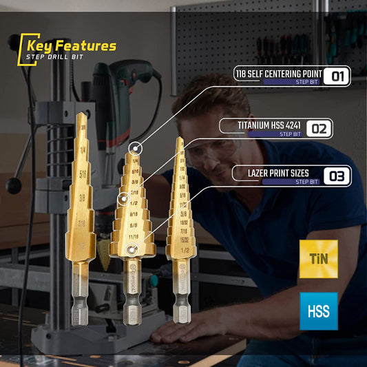 Step Drill Bit for Metal, Step Drill Bit, 3PCS Titanium Unibit Step Drill Bit Set, High Speed Steel Step Drill Bit HSS Quick Change 1/4" Shank,Total 28 Sizes 3/16" -1/2",1/4"-3/4",1/8"-1/2"